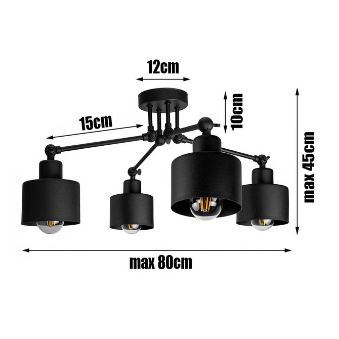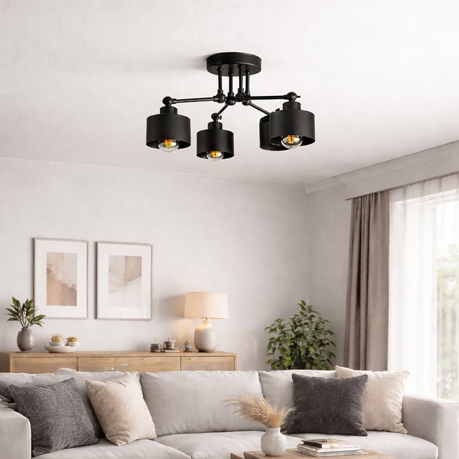 Aura light plafonjera 6031/4 izrađena je od metala u mat crnoj boji i ima 4 cilindrična reflektora postavljena na nosećim zglobnim šipkama. Luster ima opciju podešavanja nosača reflektorskih zvona u dve tačke, što omogućava usmeravanje svetlosti u željenom pravcu. Sa 4 sijalična grla E27, koja nose mesta za sijalicu snage do 60W, obezbediće optimalno osvetljenje i pravilnu raspodelu svetlosti u prostoriji. Plafonjera može da se montira u dnevnu sobu, trpezariju ili radnu sobu. Prodaje se bez izvora svetlosti, a veliki izbor sijalica možete pogledati na našem sajtu.
