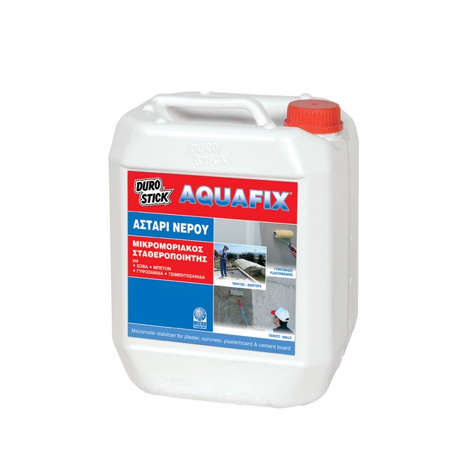 Duro Stick Aquafix prajmer - stabilizator za zidove 5l je mikromolarni stabilizator sa visokom penetracionom sposobnošću, bez rastvarača. Stvara potrebne uslove za lepljenje na poroznim i nestabilnim površinama, koje treba premazati bojom, hidroizolacionim materijalima, akrilnim ili cementim premazima i lepkom za pločice. Idealan je i kao prajmer pre nanošenja zaštitnih lakova, čuva i štiti njihovu boju.