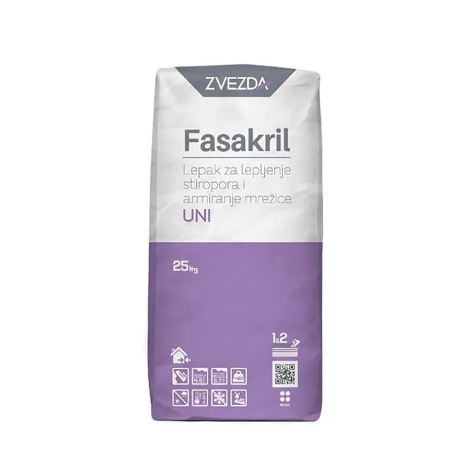 FASAKRIL lepak za stiropor UNI 25 kg je građevinski lepak na bazi polimera, cementa i pažljivo odabranih aditiva namenjen je za spoljašnju i unutrašnju upotrebu u termoizolacionim fasadnim sistemima. Koristi se za lepljenje termoizolacionih ploča od stiropora, armiranje staklene mrežice i izravnavanje površina. Odlikuje ga izuzetna snaga lepljenja, fleksibilnost i paropropusnost, što obezbeđuje dugotrajnost i pouzdanost sistema. Jednostavan je za pripremu i nanošenje, omogućava sigurno pričvršćivanje ploča, kvalitetno armiranje i ravnu završnu površinu, čime doprinosi visokom kvalitetu i trajnosti termoizolacione fasade.