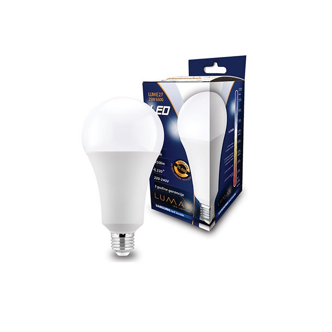 LUMAC Led sijalica 27-25W radi na naponu od 220–240V i ima širok ugao osvetljenja od 200°, što je čini pogodnom za ravnomerno osvetljavanje većih prostora. Emituje hladno belu svetlost temperature boje 6500K, idealnu za radne ili poslovne prostore. Sijalica koristi standardno E27 grlo, a izrađena je od plastike i aluminijuma, što omogućava dobru toplotnu provodljivost i dugotrajnost. Ugrađen je Epistar LED čip, poznat po stabilnosti i kvalitetu osvetljenja. Predviđeni radni vek sijalice je 35.000 sati, uz radnu temperaturu u rasponu od -20°C do +40°C, što omogućava upotrebu u različitim uslovima